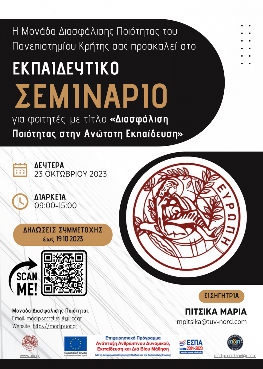 Υλικό Εκπαιδευτικών Σεμιναρίων Παρουσίαση ΣΕΜΙΝΑΡΙΟ «ΟΦΕΛΗ ΑΠΟ ΤΗΝ ΕΦΑΡΜΟΓΗ ΣΥΣΤΗΜΑΤΩΝ ΔΙΑΧΕΙΡΙΣΗΣ ΠΟΙΟΤΗΤΑΣ»Ημερομηνία διεξαγωγής: 22 – 23 Σεπτεμβρίου 2022Τρόπος διεξαγωγής: Δια ζώσηςΕισηγήτρια: Πιτσίκα Μαρία Παρουσίαση ΣΕΜΙΝΑΡΙΟ «KEY PERFOMANCE INDICATORS (KPIs)»Ημερομηνία διεξαγωγής:24 – 25 Ιουλίου 2023Τρόπος διεξαγωγής: ΔιαδικτυακάΕισηγητής: Θεοφανίδης Κώστας Παρουσίαση ΣΕΜΙΝΑΡΙΟ «PROJECT MANAGEMENT – HARD & SOFT SKILLS»Ημερομηνία διεξαγωγής:26 – 27 Ιουλίου 2023Τρόπος διεξαγωγής: ΔιαδικτυακάΕισηγήτρια: Θεοφανίδη Κατερίνα Παρουσίαση ΣΕΜΙΝΑΡΙΟ «ΔΙΟΙΚΗΣΗ ΠΟΙΟΤΗΤΑΣ»Ημερομηνία διεξαγωγής:25 Σεπτεμβρίου 2023 Τρόπος διεξαγωγής: ΔιαδικτυακάΕισηγήτρια: Πιτσίκα Μαρία Παρουσίαση ΣΕΜΙΝΑΡΙΟ «ΑΡΧΕΣ ΔΙΟΙΚΗΣΗΣ»Ημερομηνία διεξαγωγής: 6 & 10 Οκτωβρίου 2023Τρόπος διεξαγωγής: ΔιαδικτυακάΕισηγήτρια: Θεοφανίδης Κώστας Παρουσίαση ΕΚΠΑΙΔΕΥΤΙΚΟ ΣΕΜΙΝΑΡΙΟ ΓΙΑ ΦΟΙΤΗΤΕΣ«ΔΙΑΣΦΑΛΙΣΗ ΠΟΙΟΤΗΤΑΣ ΣΤΗΝ ΑΝΩΤΑΤΗ ΕΚΠΑΙΔΕΥΣΗ»{ Αφίσα σεμιναρίου }Ημερομηνία διεξαγωγής: 23 Οκτωβρίου 2023Τρόπος διεξαγωγής: ΔιαδικτυακάΕισηγήτρια: Πιτσίκα Μαρία Δείτε το αρχείο με τα «Προγράμματα Εκπαίδευσης» για τα μέλη της Πανεπιστημιακής Κοινότητας και για τους φοιτητές του Πανεπιστημίου Κρήτης.